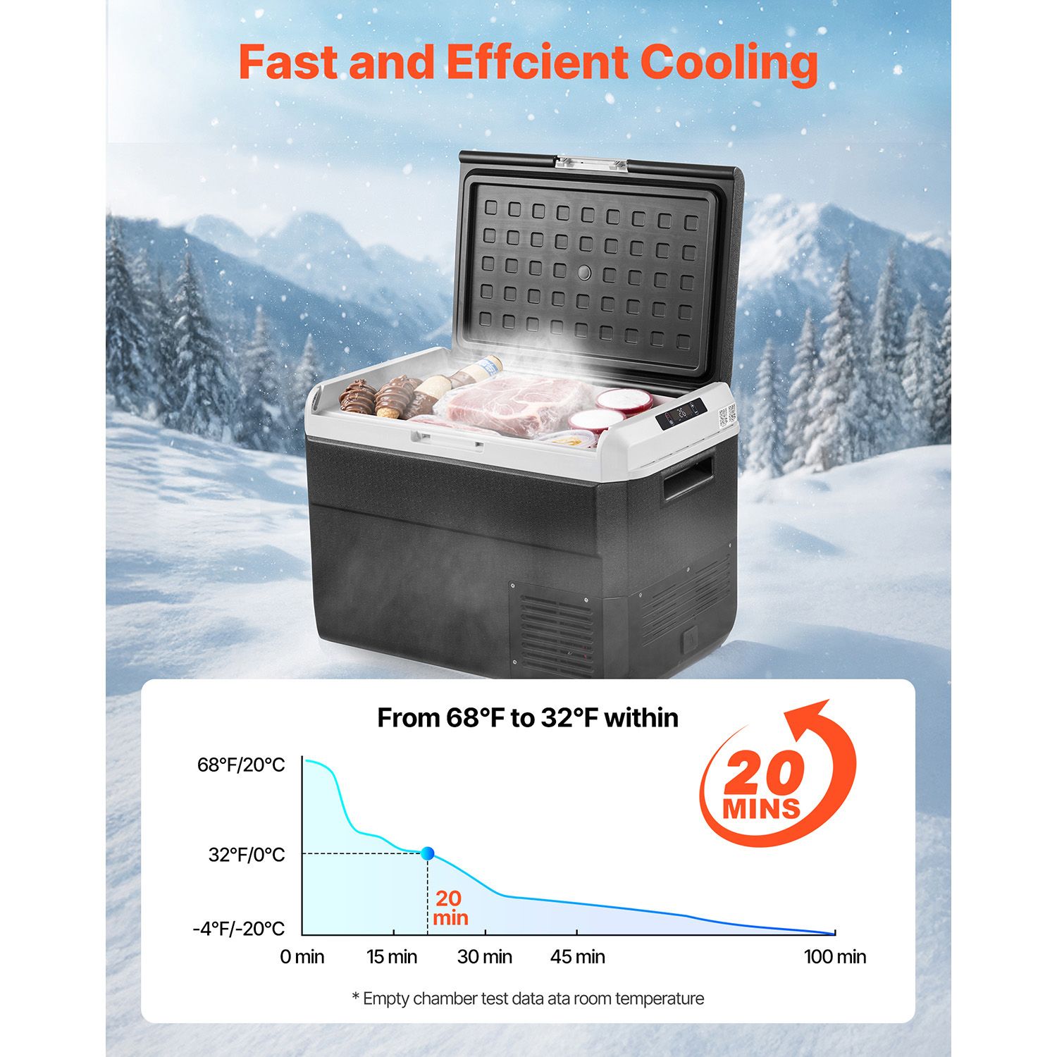 2.Rapid Cooling: Experience quick and efficient cooling with our car fridge. Equipped with an upgraded compressor, it can cool from 68Fahrenheit to 32Fahrenheit in just 20 mins, and cool to -4Fahrenheit in 80 mins, ensuring your beverages and food stay refreshingly chilled